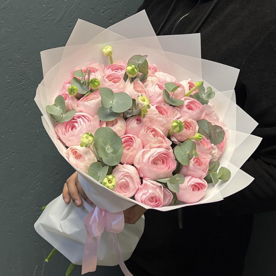 На фото букет из 29 розовых ранункулюсов с эвкалиптом. В составе: ранункулюс 29 шт, эвкалипт 10 шт, дизайнерская упаковка 2 шт, атласная лента 1 шт, . Все цветы свежие и ароматные, букет красиво оформлен и отлично подходит для подарка. Доступна доставка цветов или самовывоз.