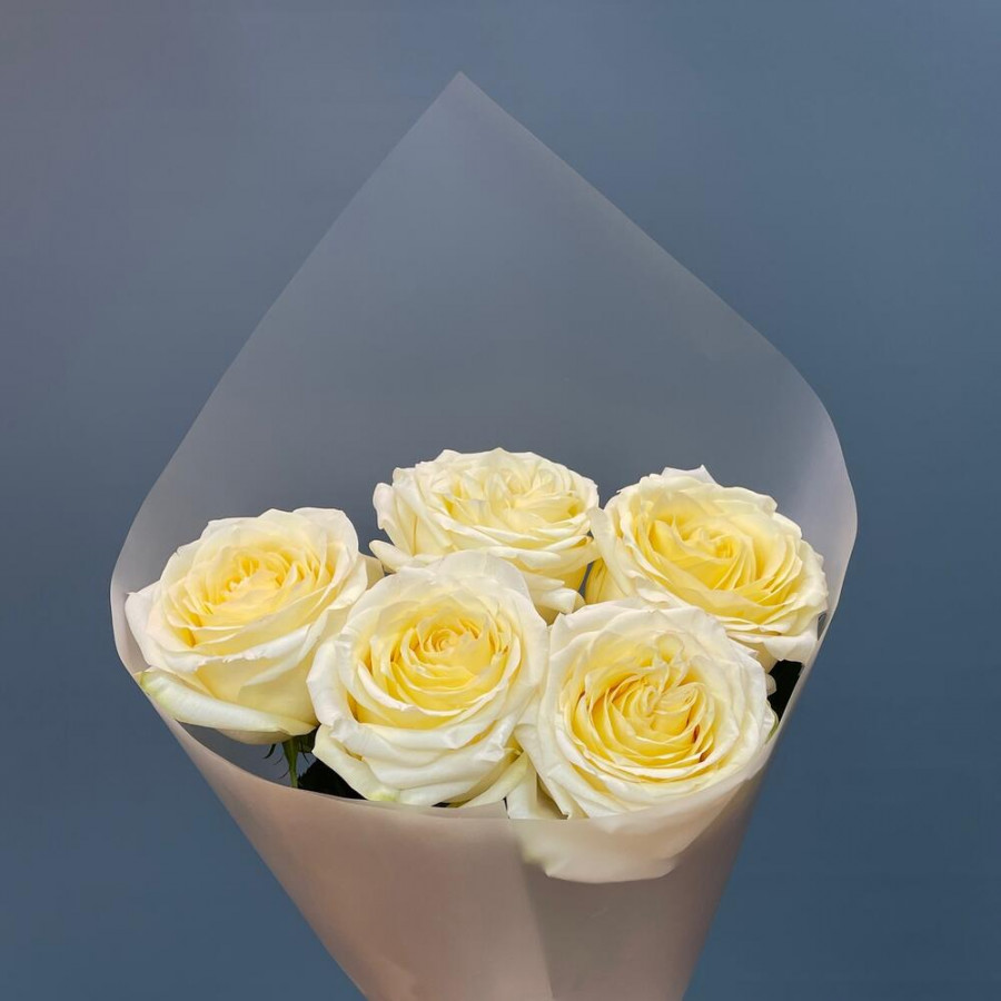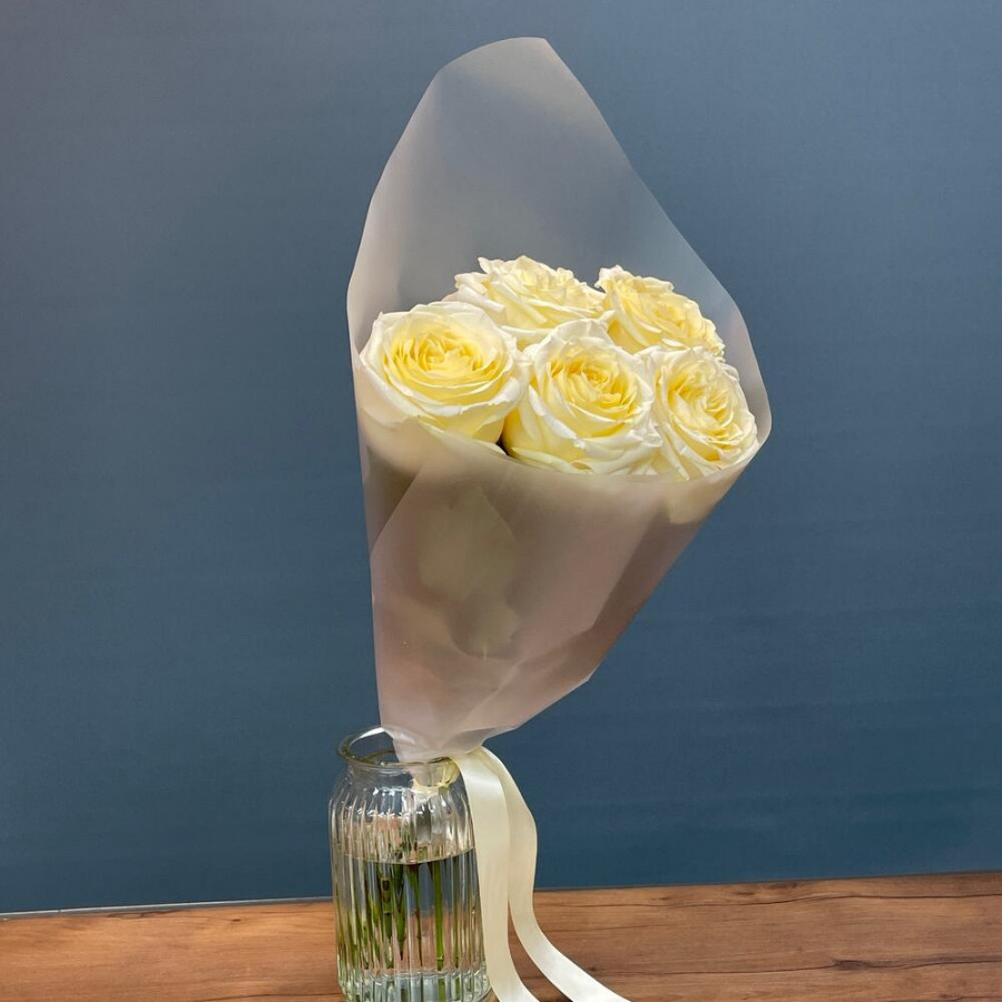 На фото 5 кремовых роз. В составе: роза 5 шт, дизайнерская упаковка 1 шт, атласная лента 1 шт, . Все цветы свежие и ароматные, букет красиво оформлен и отлично подходит для подарка. Доступна доставка цветов или самовывоз.