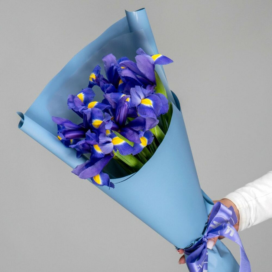 На фото букет из 7 синих ирисов. В составе: ирис 7 шт, дизайнерская упаковка 1 шт, атласная лента 1 шт, . Все цветы свежие и ароматные, букет красиво оформлен и отлично подходит для подарка. Доступна доставка цветов или самовывоз.