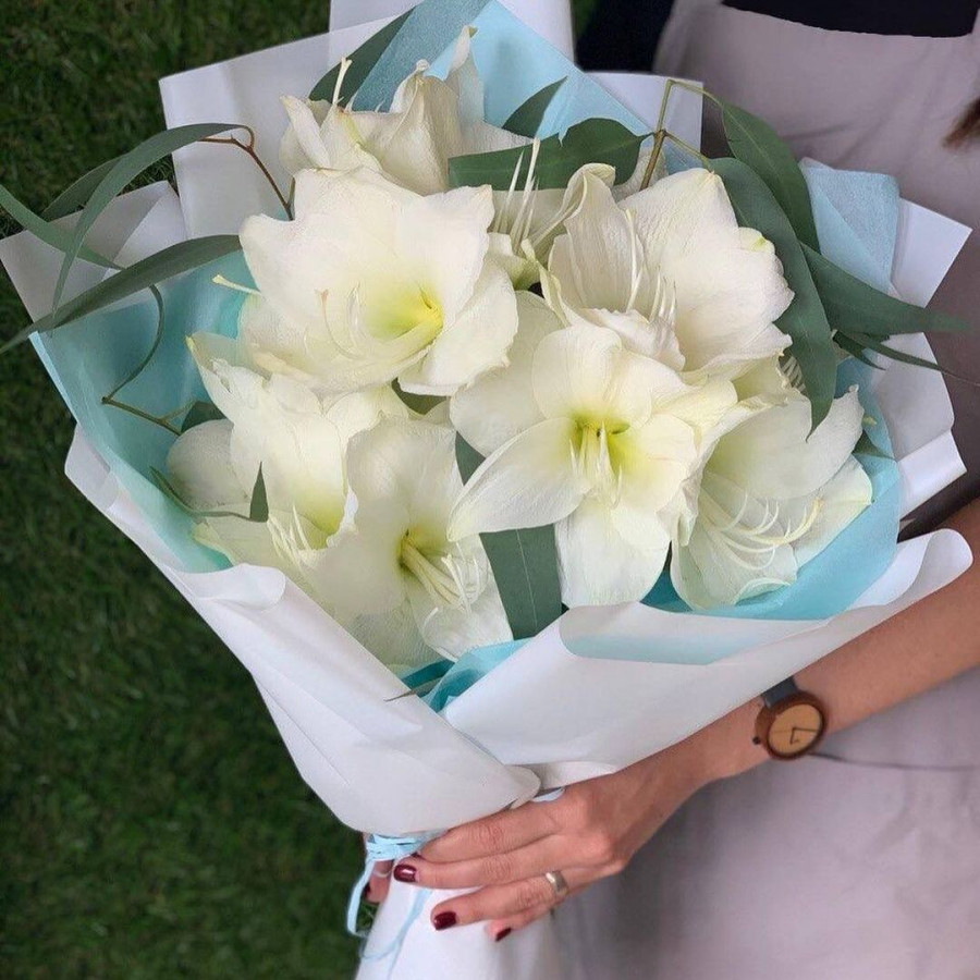 На фото букет из 9 белых амариллисов. В составе: амариллисы 9 шт, берграсс 2 шт, крафт-бумага 1 шт, атласная лента 1 шт, . Все цветы свежие и ароматные, букет красиво оформлен и отлично подходит для подарка. Доступна доставка цветов или самовывоз.