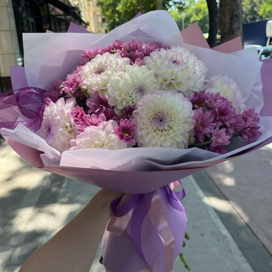 На фото букет из георгин и хризантем. В составе: георгина 9 шт, хризантема кустовая 5 шт, дизайнерская упаковка 2 шт, атласная лента 1 шт, . Все цветы свежие и ароматные, букет красиво оформлен и отлично подходит для подарка. Доступна доставка цветов или самовывоз.