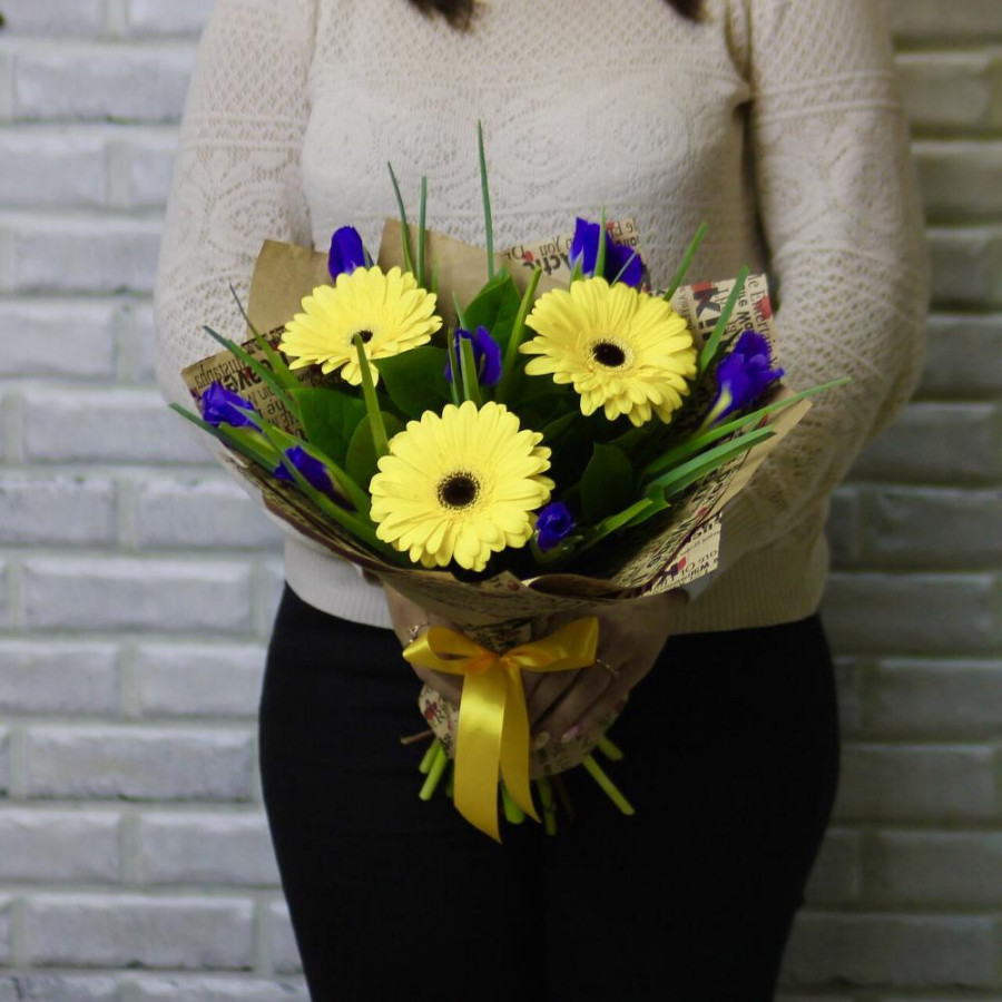 Букет из желтых гербер с синими ирисами в Ханты-Мансийске