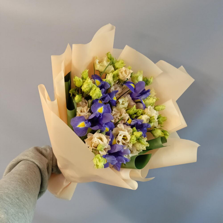 На фото букет из синих ирисов и кремовых эустом. В составе: ирис 5 шт, эустома (лизиантус) 4 шт, дизайнерская упаковка 1 шт, атласная лента 1 шт, . Все цветы свежие и ароматные, букет красиво оформлен и отлично подходит для подарка. Доступна доставка цветов или самовывоз.