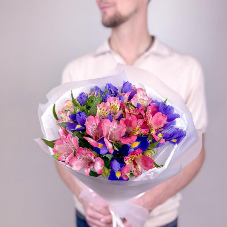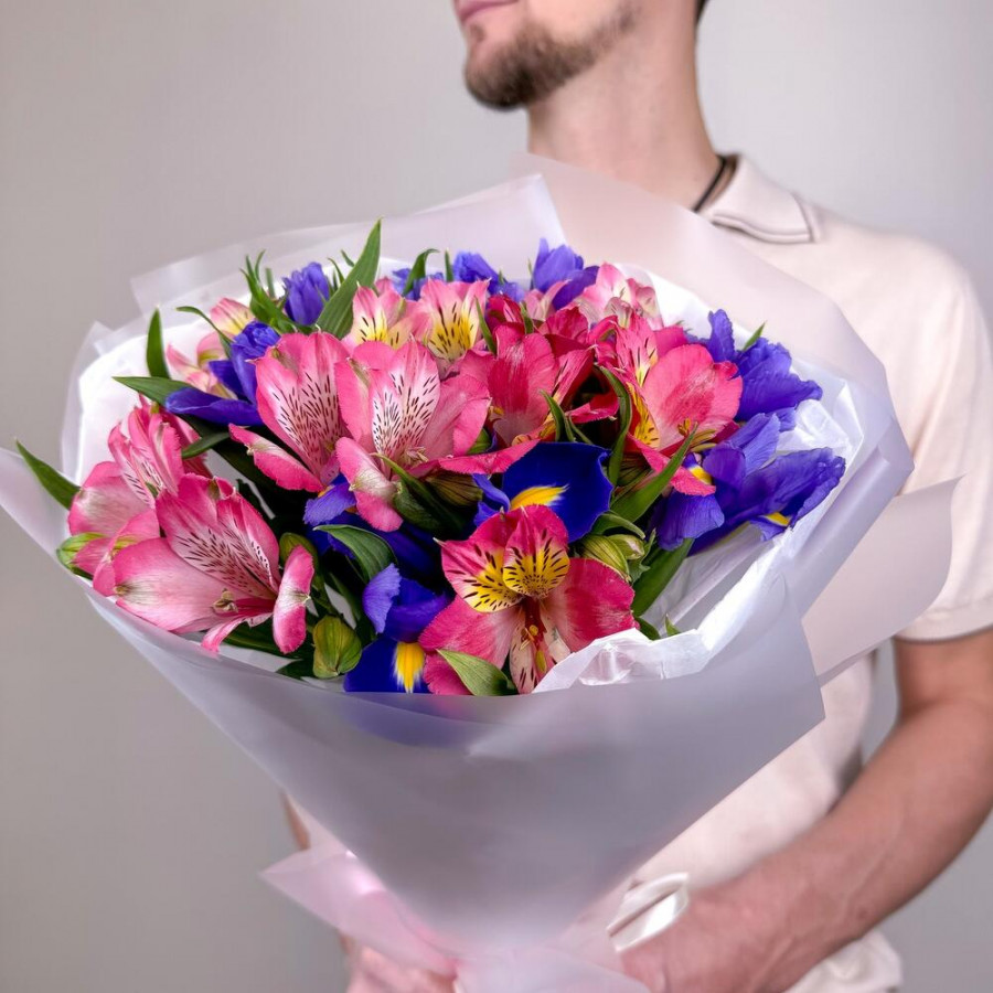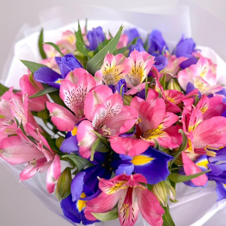 Букет из синих ирисов из розовых альстромерий в Ханты-Мансийске
