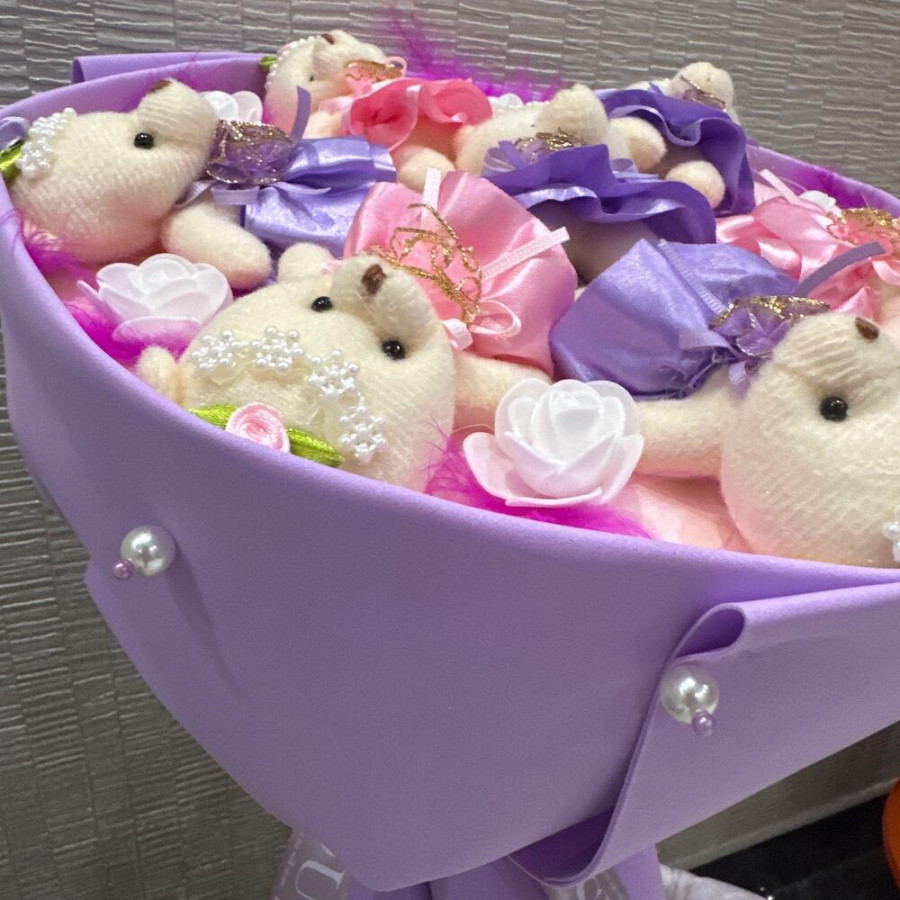 На фото мягкий букет принцесс-медвежат. В составе: . Все цветы свежие и ароматные, букет красиво оформлен и отлично подходит для подарка. Доступна доставка цветов или самовывоз.