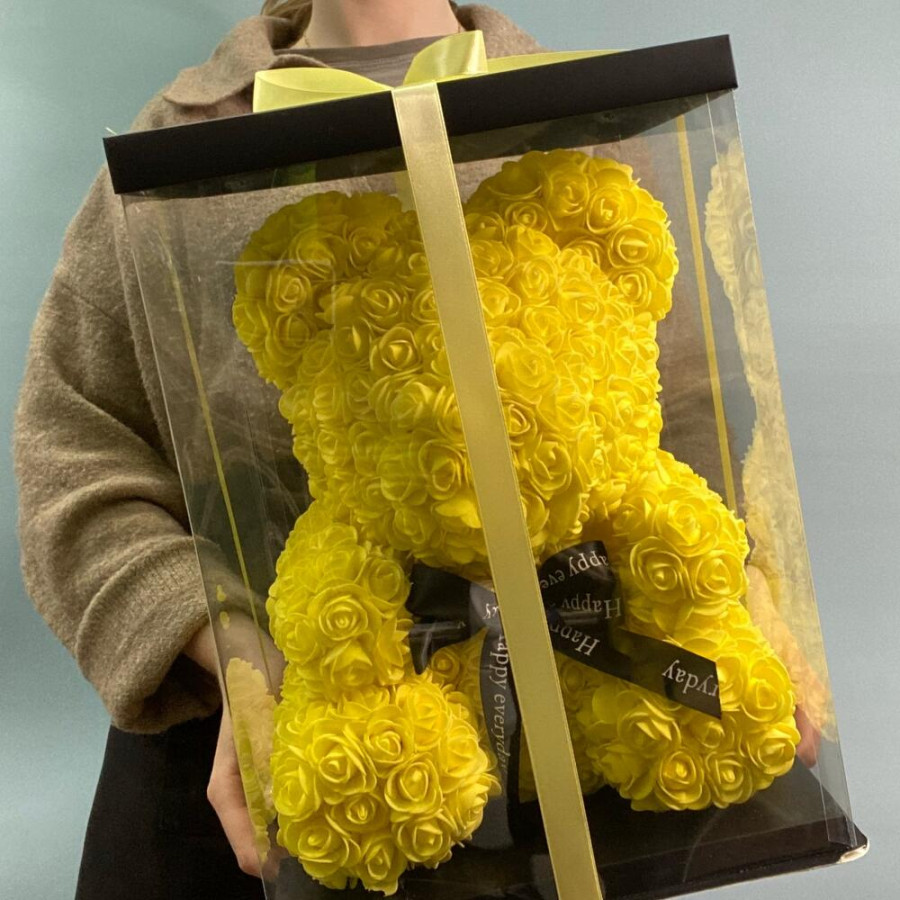 На фото желтый мишка из роз с огоньками. В составе: . Все цветы свежие и ароматные, букет красиво оформлен и отлично подходит для подарка. Доступна доставка цветов или самовывоз.
